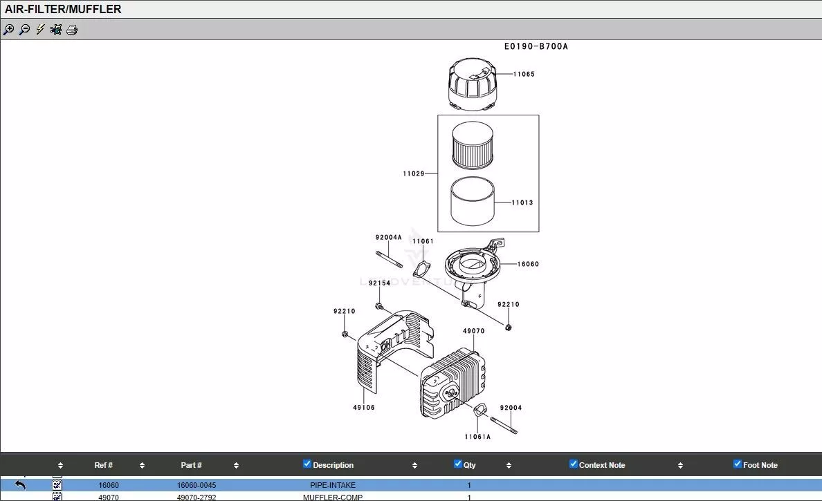 Genuine Kawasaki 16060-0045, 11065-2135, 11029-0032 Air Filter Ass. Intake Pipe, Cap, Air Filter.