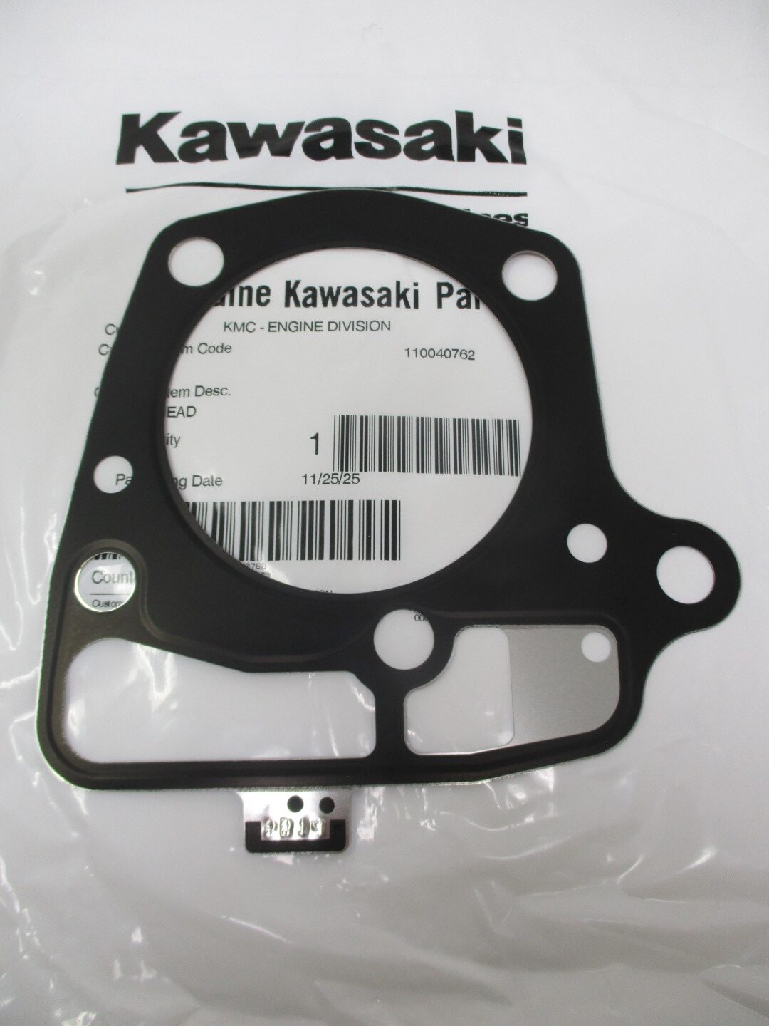 This genuine Kawasaki head gasket (part #11004-0762) is the updated replacement that supersedes the older 11004-0726. It provides a critical seal between the cylinder and crankcase on compatible FR, FS, FT, and FX series engines, shipped with protective packaging.